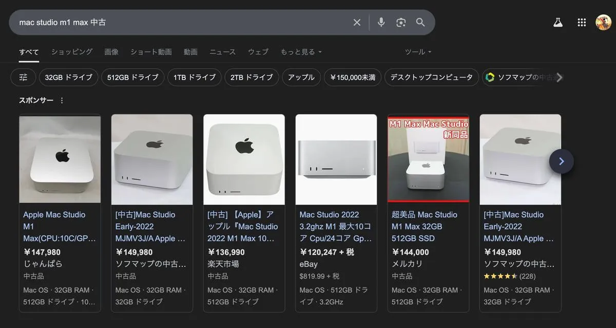 Mac Studio M1Maxの中古価格を調べると、150,000円以下で購入できることがわかりました。