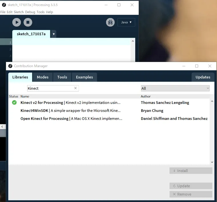 - 再起動後、“Tools->Add Tools..”を開き、Librariesタブへ移動し**“Kinect v2 for Processing”**をインストールする