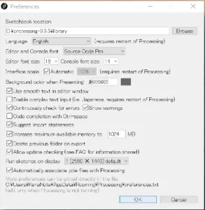 - Processingを起動後、“ファイル->設定”を開き、以下のところを変更する