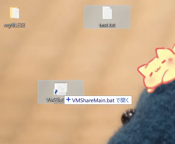 あとは下記の画像の感じにバーチャルマシンを起動した状態でVMへ送信したファイルをbatにドラックアンドドロップすると共有されます