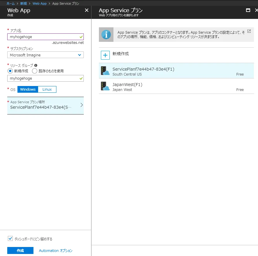 App Serevice プラン/場所では、デフォルトでもおkですが私は物理的に近いところ(日本)にしました