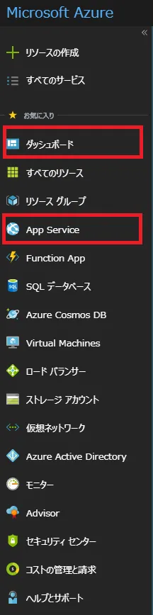 左の項目にあるダッシュボードまたは、App Serviceに作成されたアプリケーションがるため、それを選択します