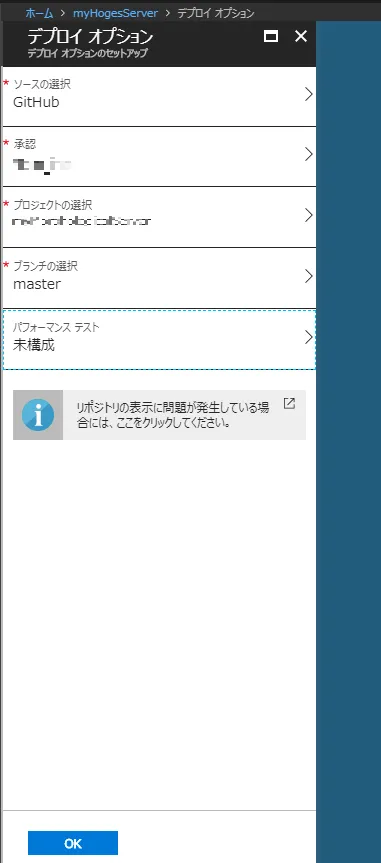 デプロイ設定にてGitHubを選択後、AzureがGitHubへのアクセスを許可し、上記で作成したリポジトリを選択します
