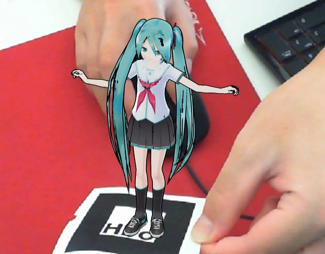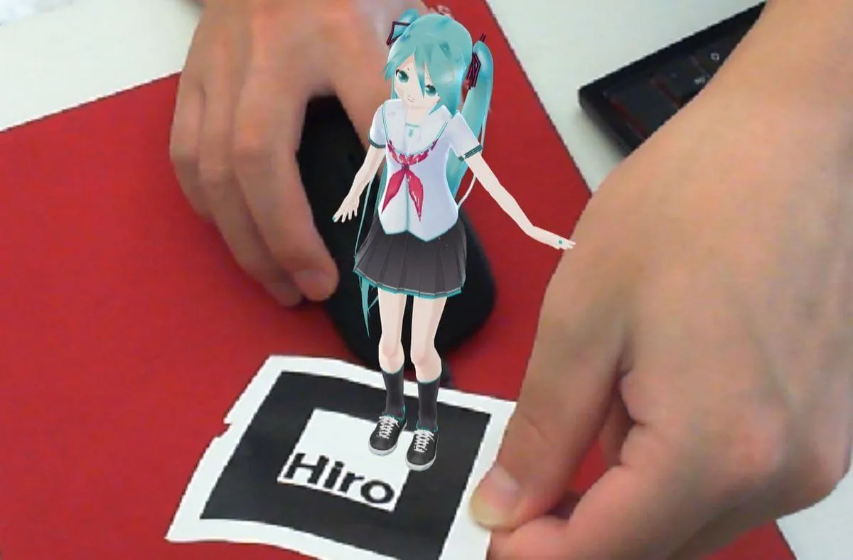 本プログラムはARのサンプルでよく使われているHiroマーカーを使い、このHiroマーカーを認識したらミクさんを召喚しています