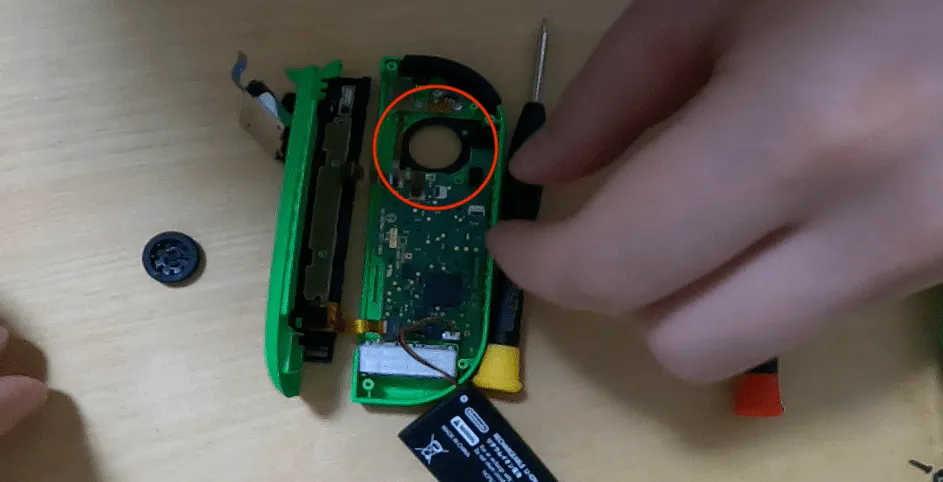 画像は既にアナログスティックを外した画像ですが,これをとっておくと部品が外しやすくなる.