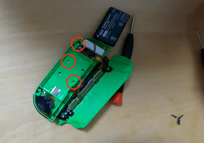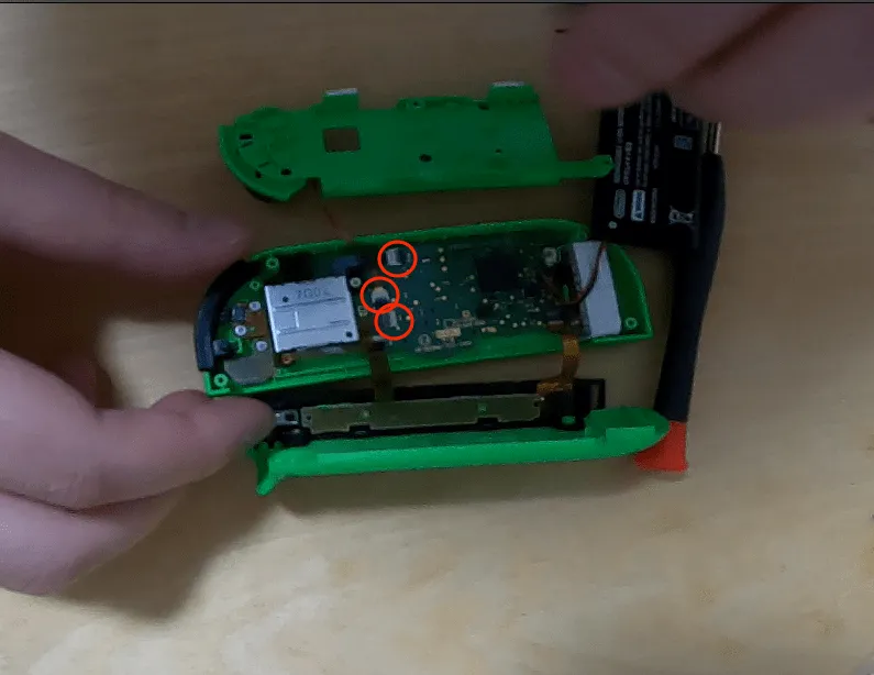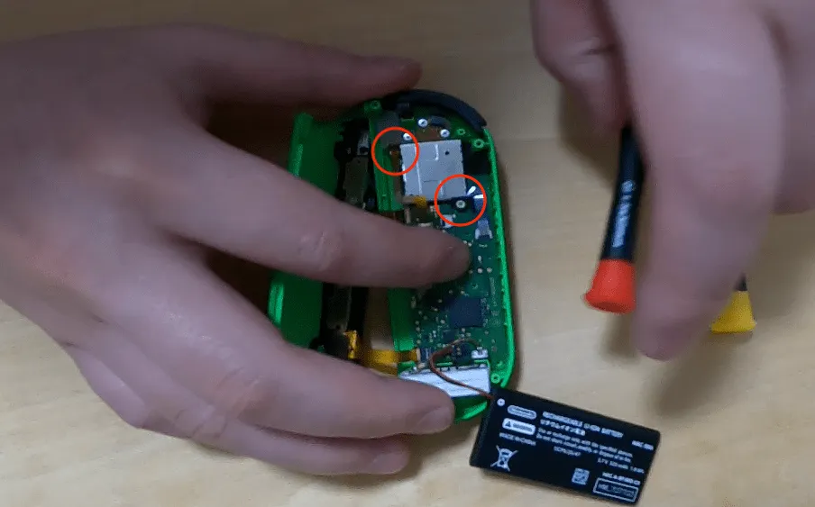 画像は既にアナログスティックを外した画像ですが,これをとっておくと部品が外しやすくなる.