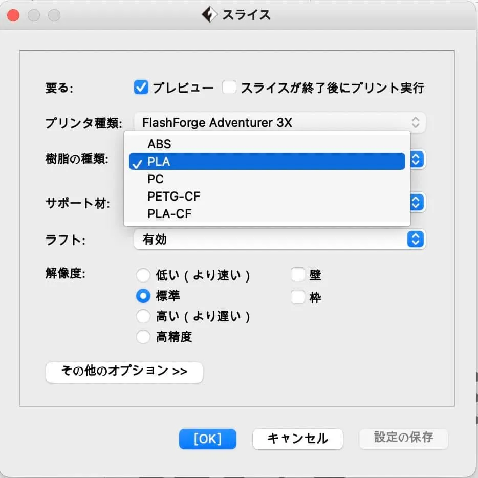 私が使っている3Dプリンタのサイトを見ると色々な素材を使えるようですが,印刷に使用するアプリ(FlashXPrint)をみるとPLA+は使えないようです.