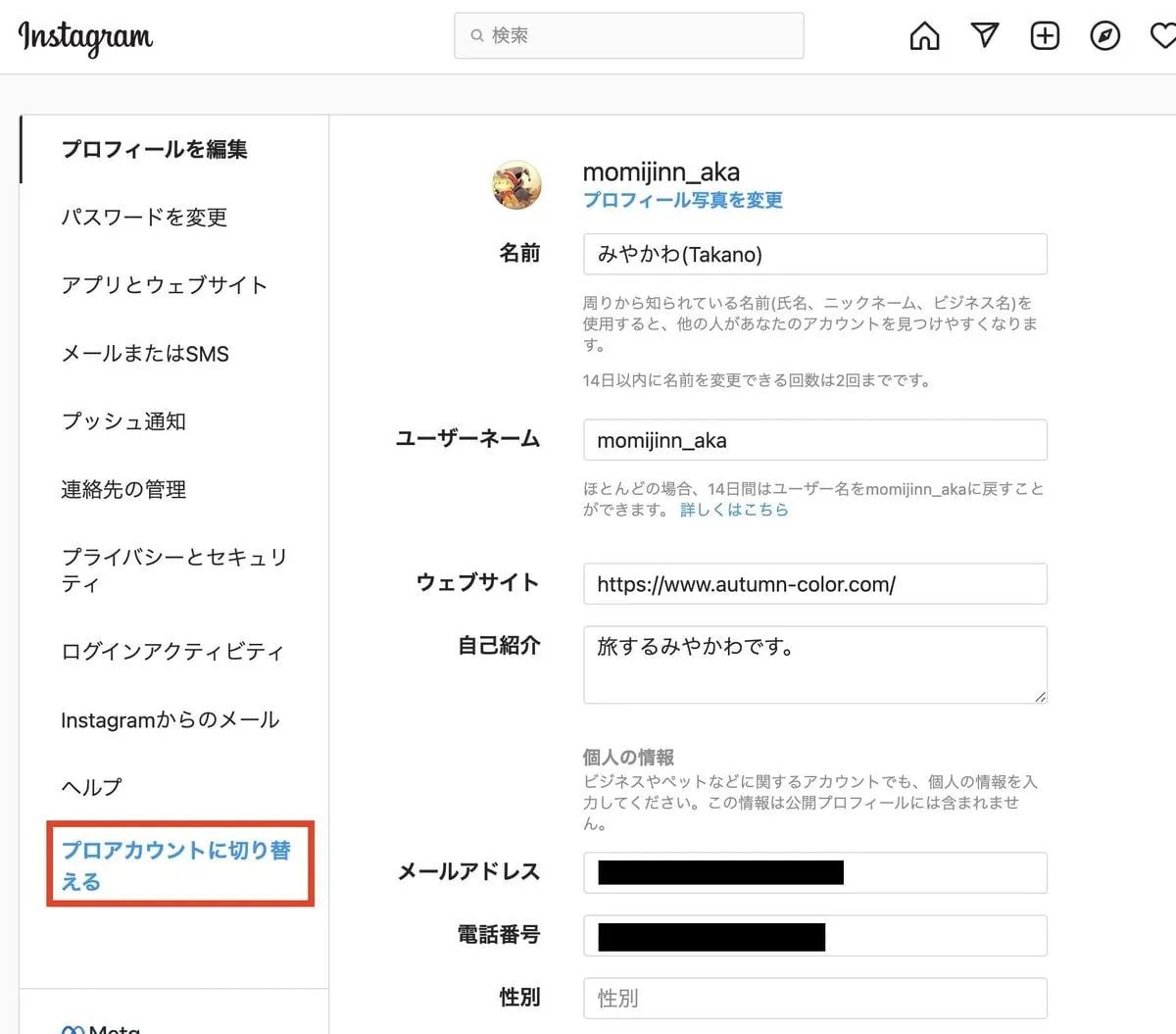 次に Instagram を Proアカウントにします。