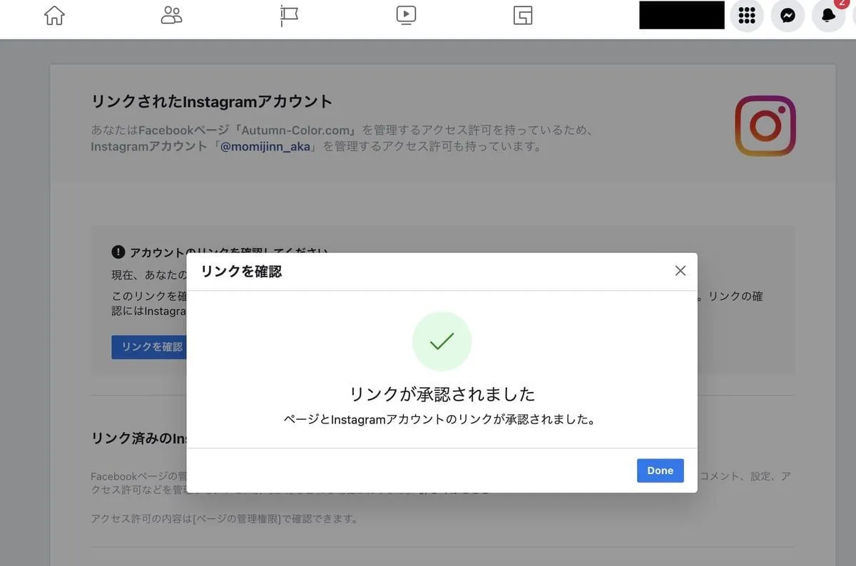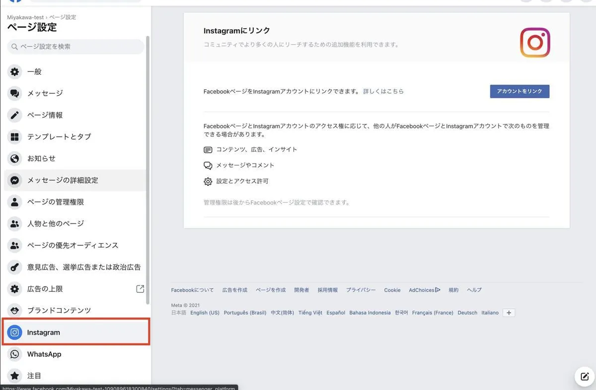 その次にページの設定からInstagramとリンクさせます。