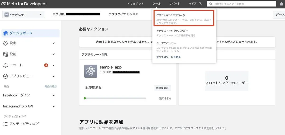 アプリを作成し終えたら、上タブにある グラフAPIエクスプローラを開きます。