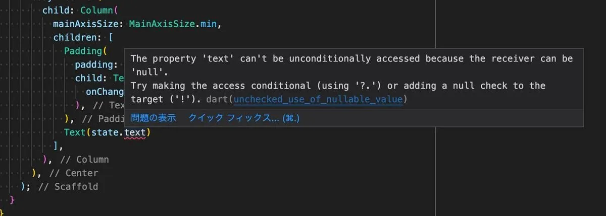 エラーメッセージに従ってnullチェックをしてもエラーは消えません。