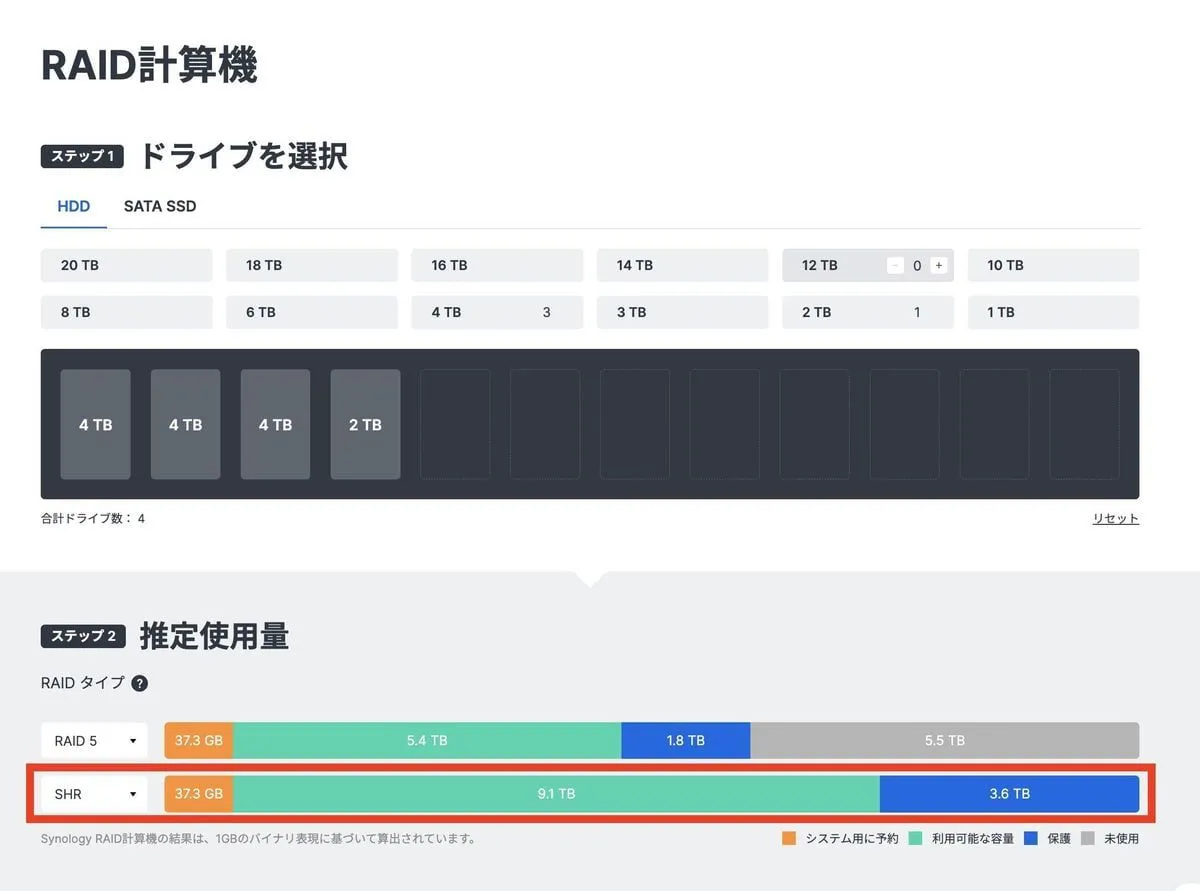 「この構成でどれくらいの容量が使えるのか」ですが、Synology のサイトの計算上 約 9.1 TB 使えるとのことです。