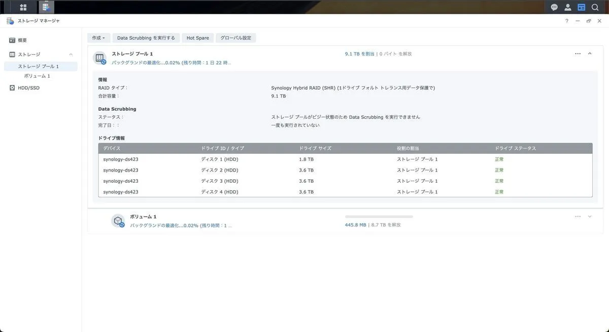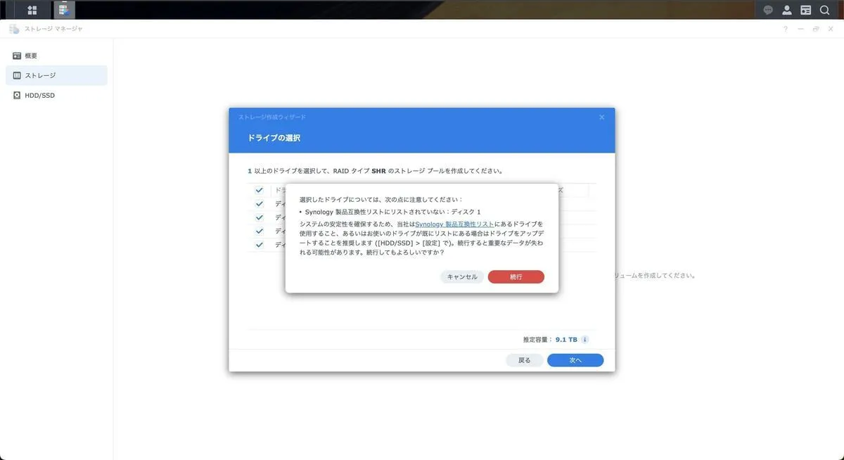 「Synology と互換性がない HDD 刺さっているけどいいのか」みたいなメッセージ出るけど気にしない。続行。