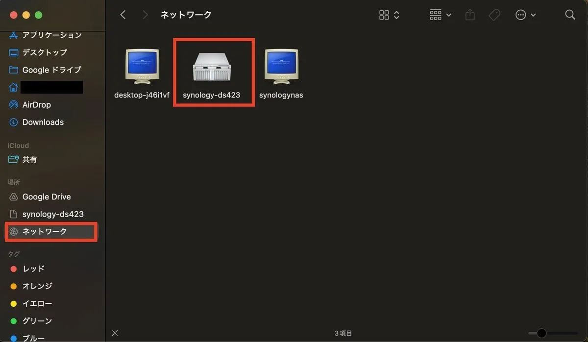 mac PCで ネットワークをみるとnasのサーバ名が出てくる。