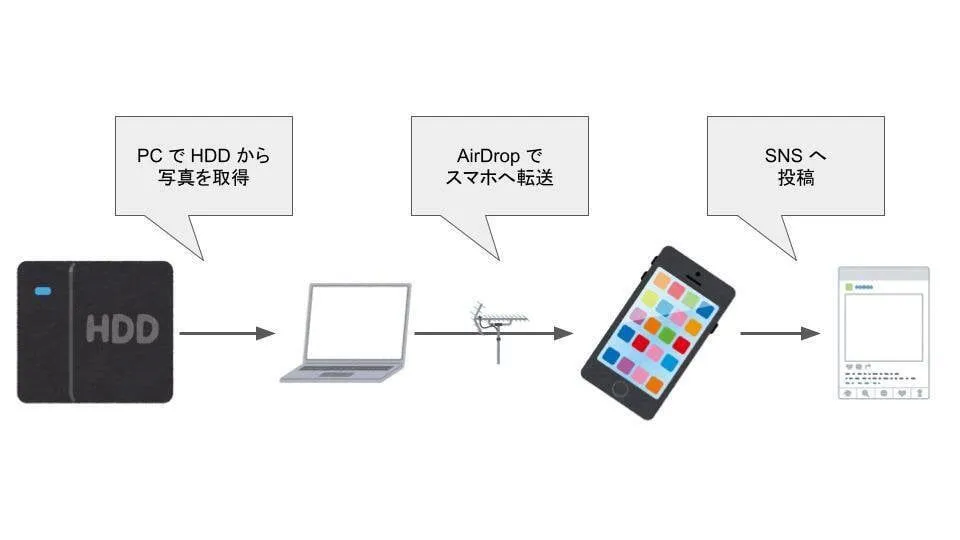 一回 PC からデータを持ってきて AirDrop で転送をしていました。