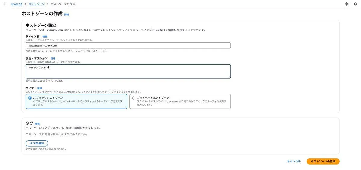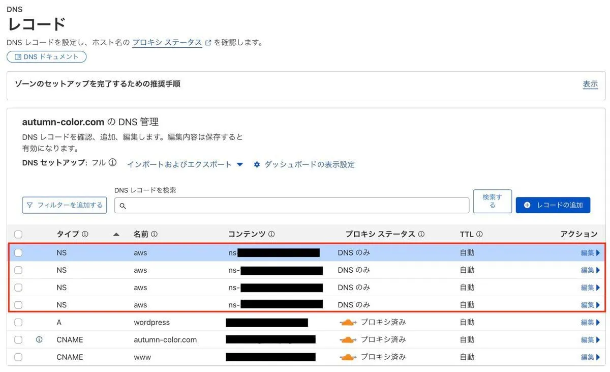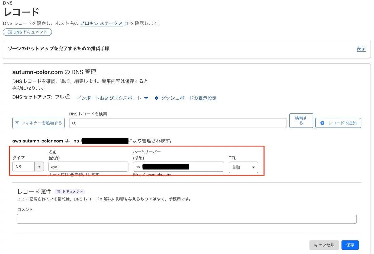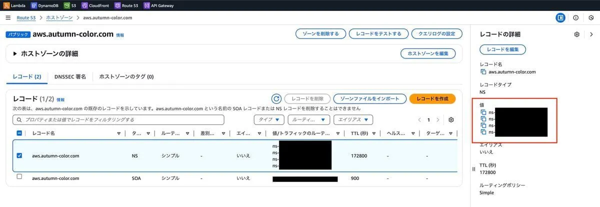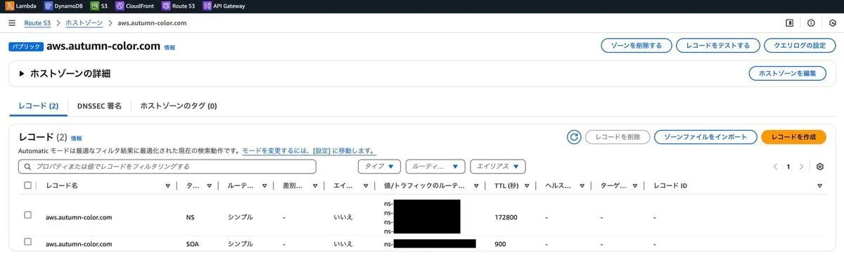 autumn-color.com に対して aws というサブドメインを生やすようにしていきます。
