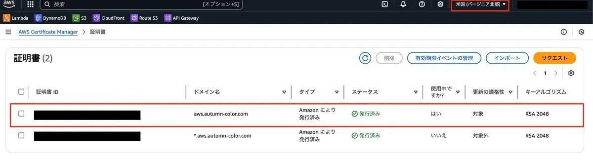 証明書は バーギニア北部( us-east-1 ) で作成してください。