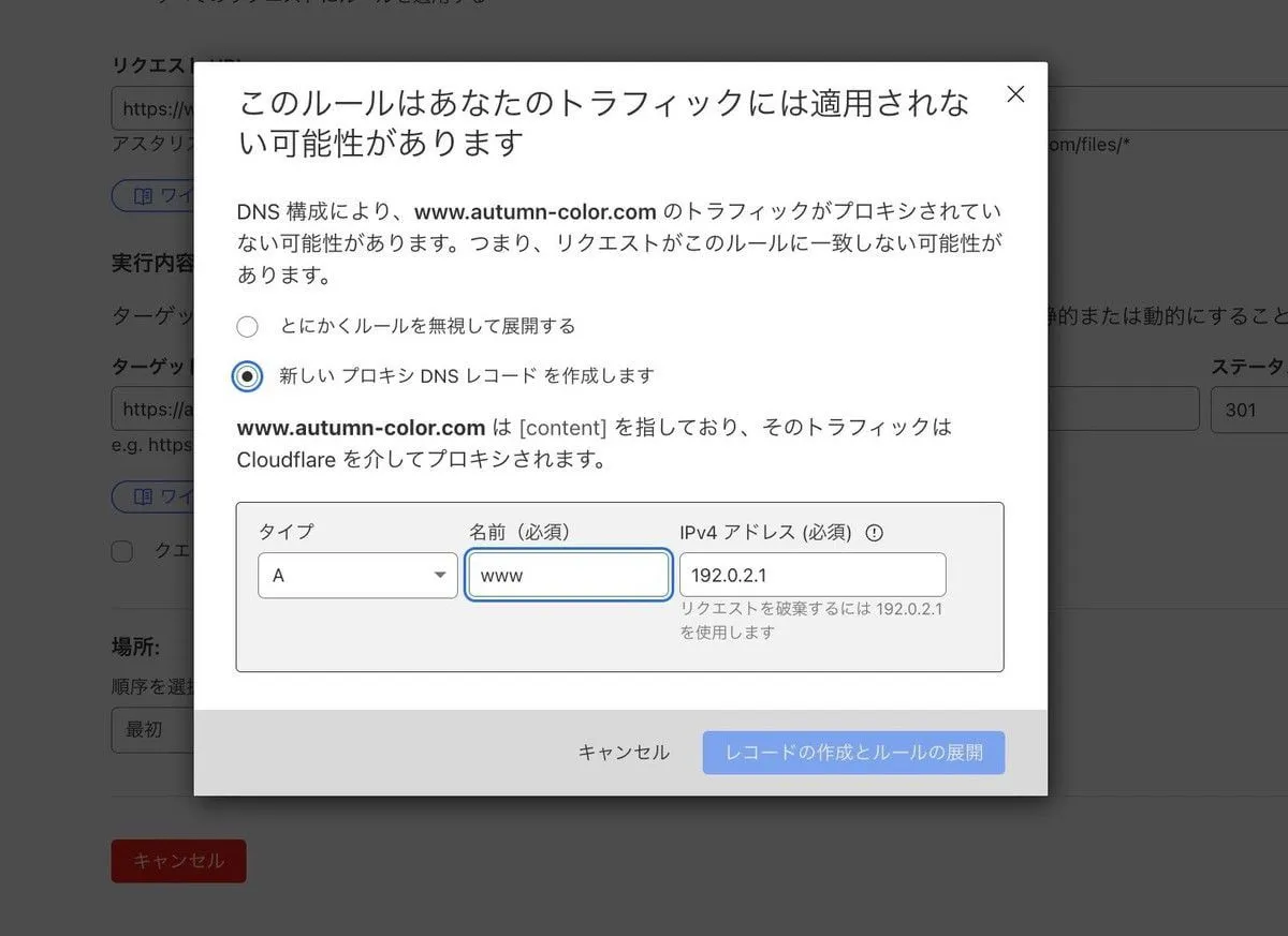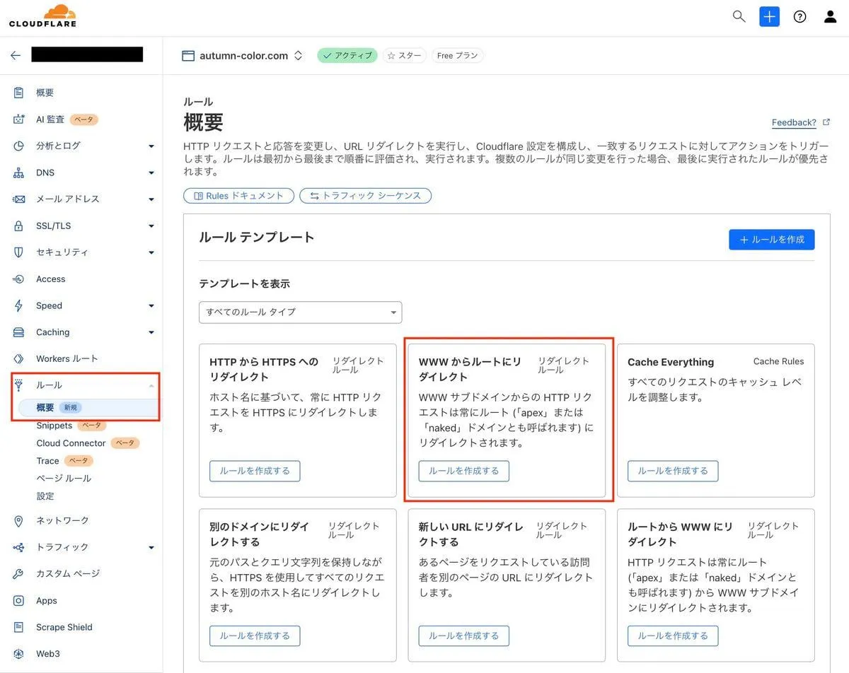wwwからルートにリダイレクト というほしかったテンプレートがあるので、これの ルートを作成する を押す。
