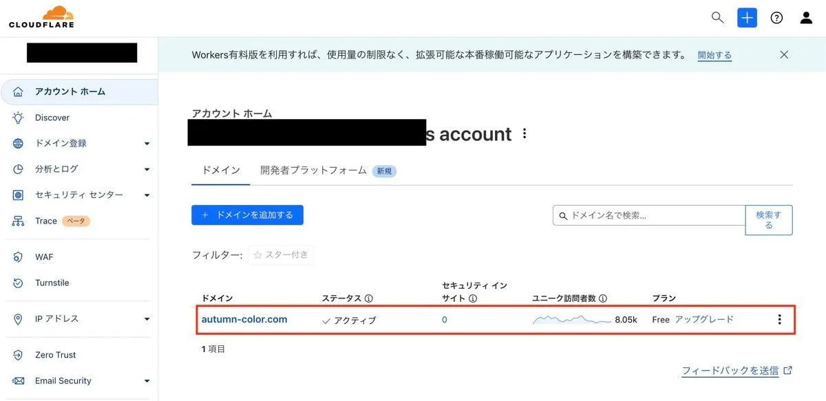 ダッシュボードより、リダイレクトしたいドメインを選択。