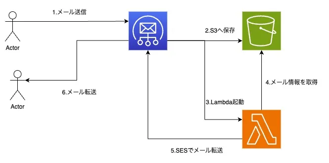 - Lambdaを起動してS3にあるメール情報を取得し、指定したメールアドレスへメール情報を転送。