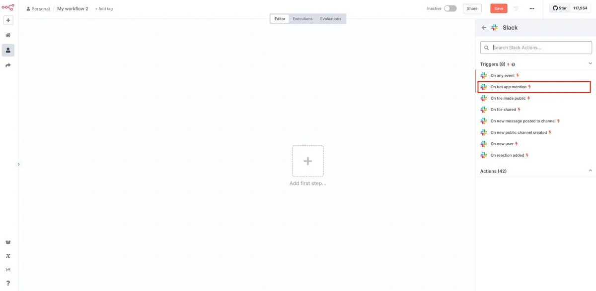 まず、n8nで新しいワークフローを作成し、SlackのTriggerノードを追加します。