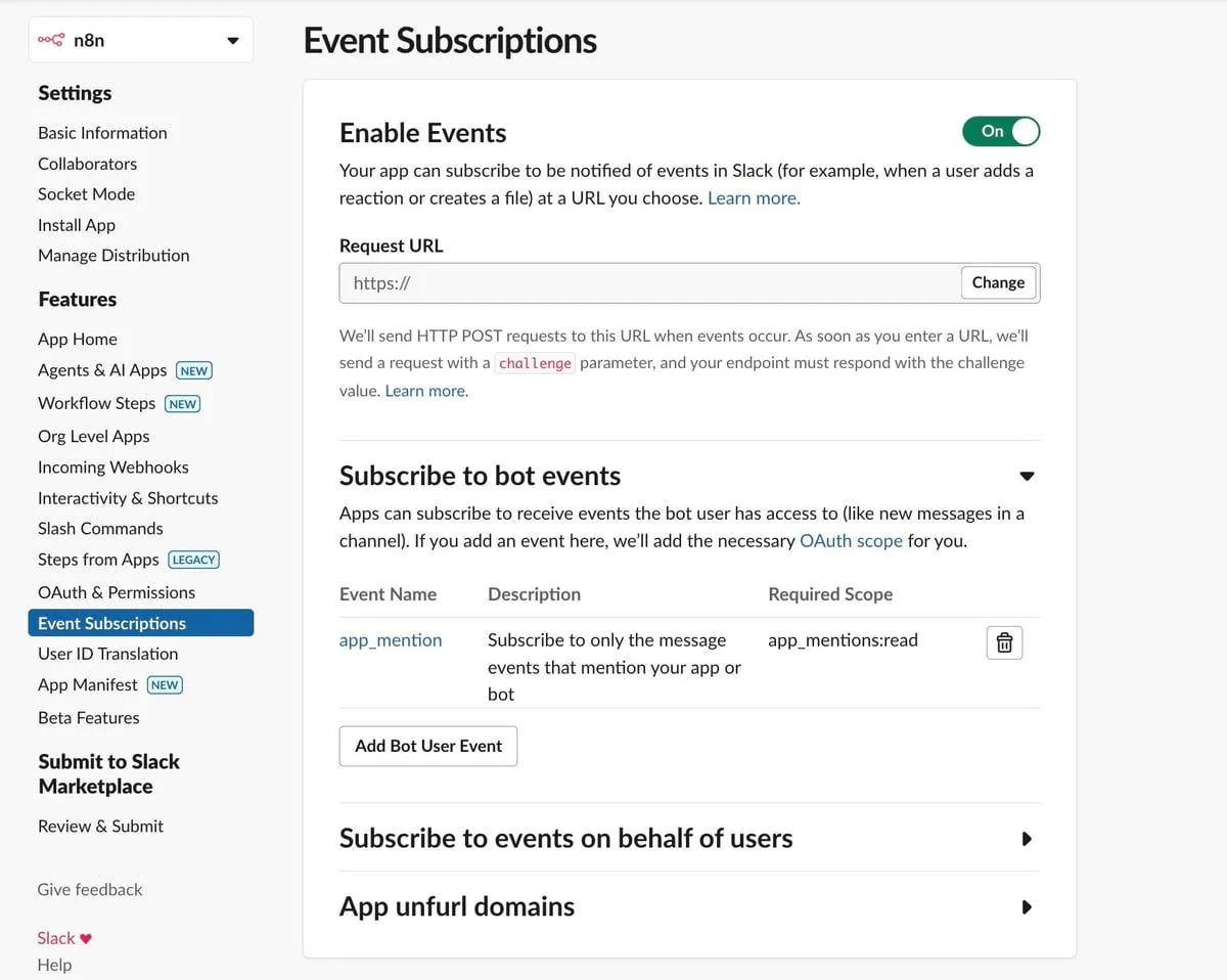 Enable EventsをオンにするSubscribe to bot eventsにapp_mentionを追加するRequest URLに、n8nのSlackトリガーノードに表示されている本番向けのURLを設定する