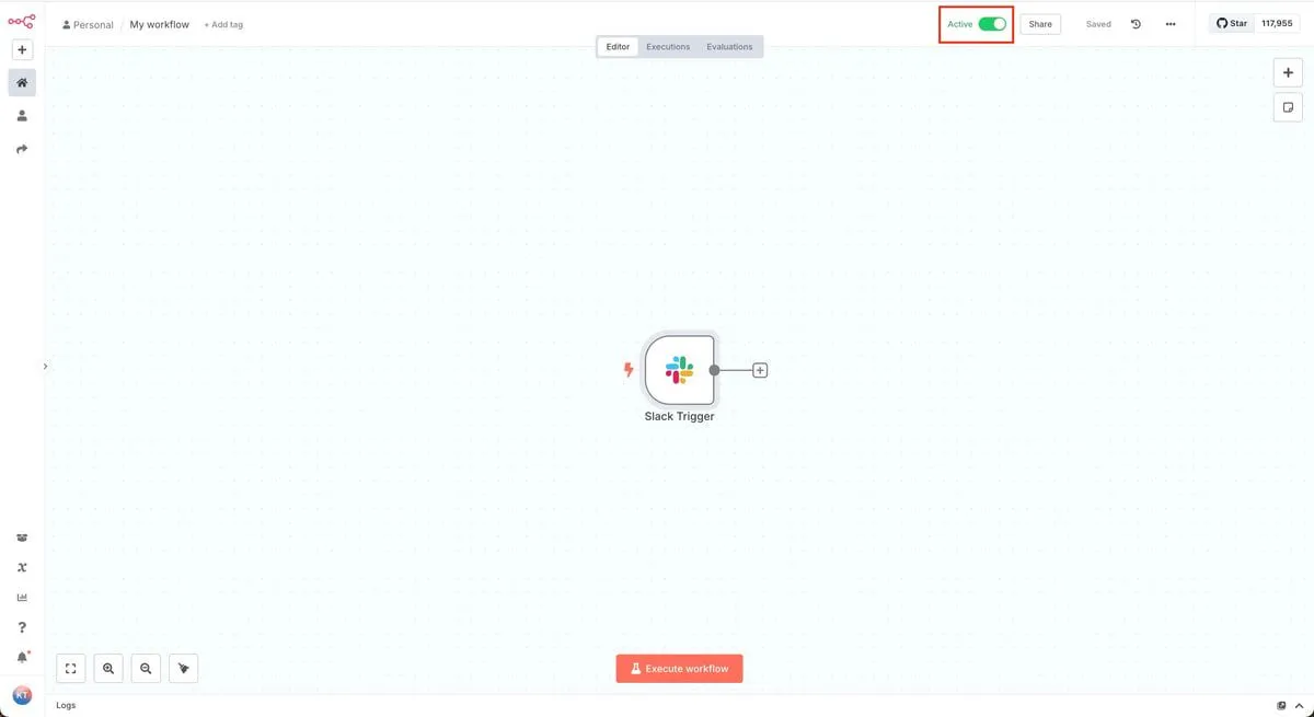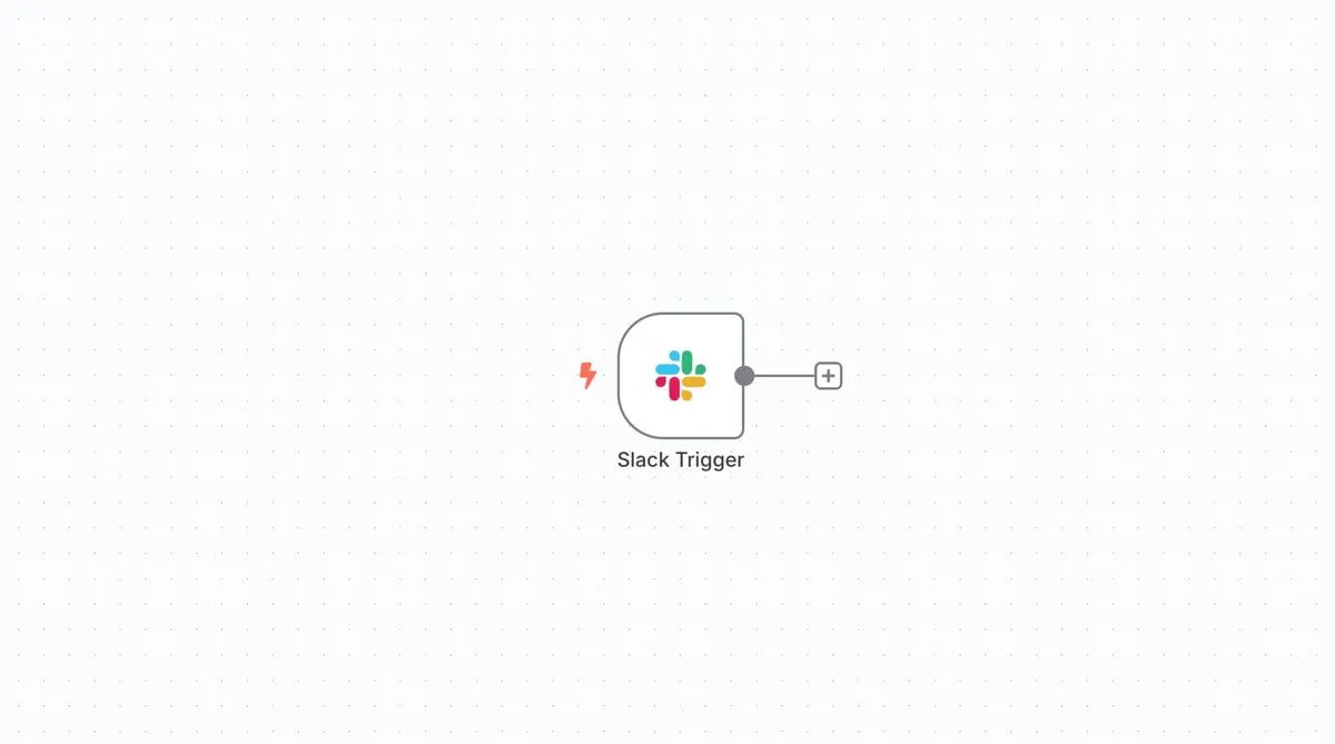 まず、n8nで新しいワークフローを作成し、SlackのTriggerノードを追加します。