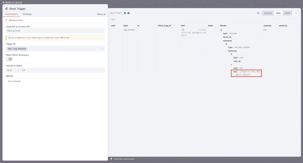 Slackでbotにメンション付きのメッセージを送信すると、n8nのワークフローが起動し、そのメッセージ内容を取得できます。