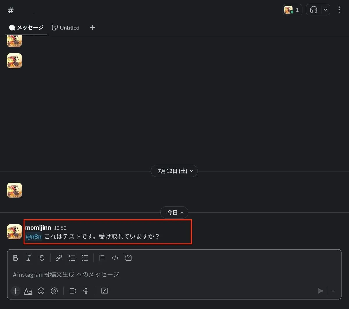| n8nで取得したメッセージ |