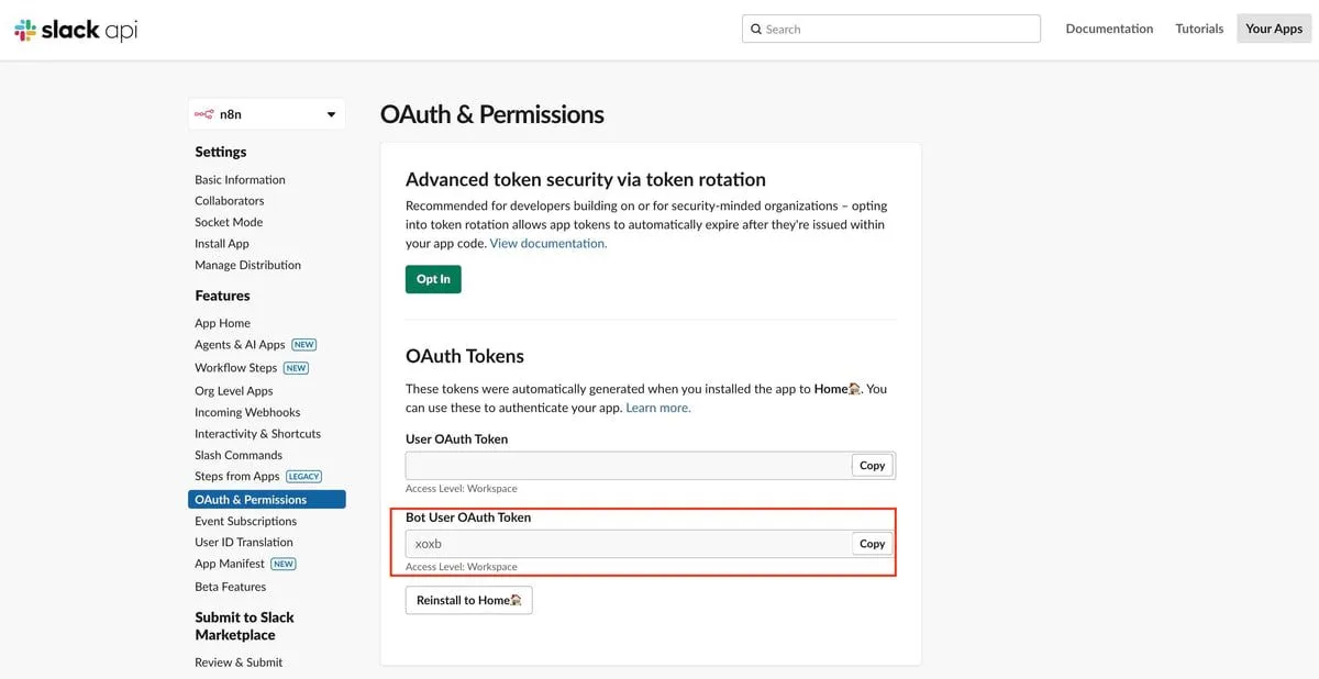 ページ内にある Bot User OAuth Token をコピーしてください。