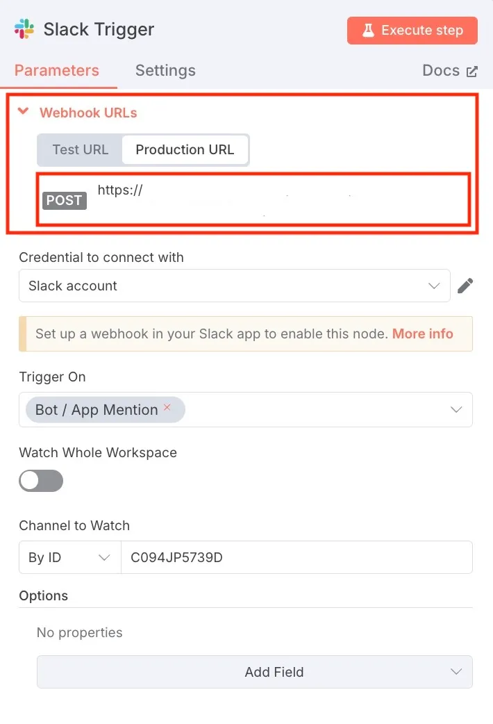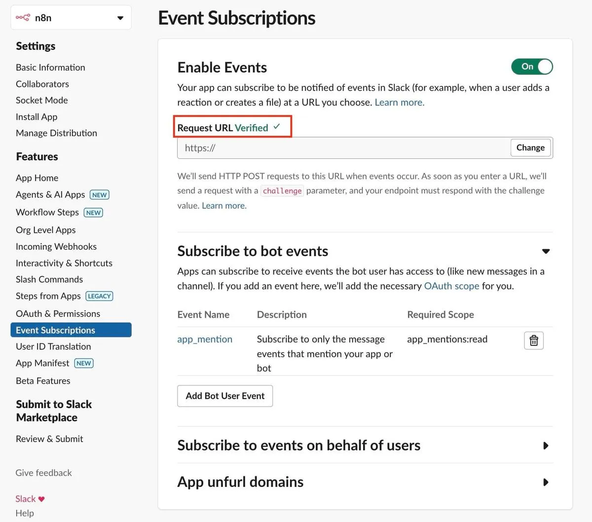 この点については、公式ドキュメントにも記載がありました。 https://docs.n8n.io/integrations/builtin/credentials/slack/#slack-trigger-configuration