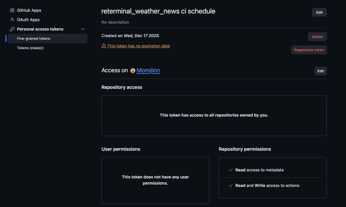 Read and Write access to actionsの権限を与えればOK。生成されたトークンは忘れずにコピーしておきましょう。PAT 作成画面