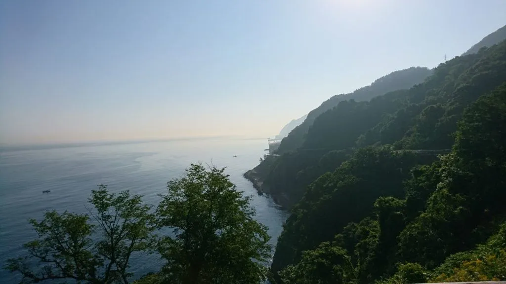 全長3km続く親不知は、歩道がなく、崖と隣り合わせで自動車とともに自転車を漕いでいきます