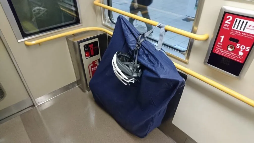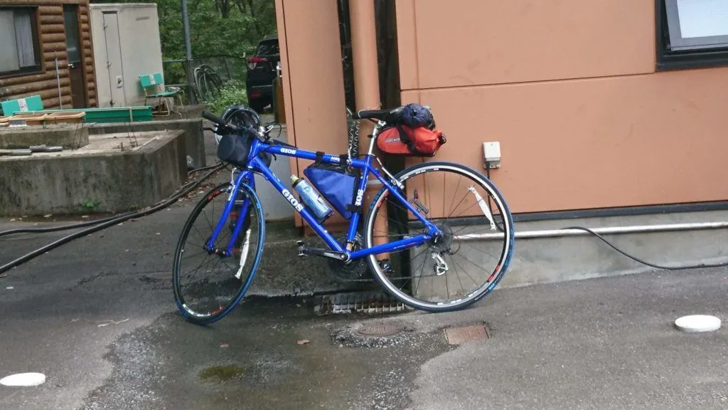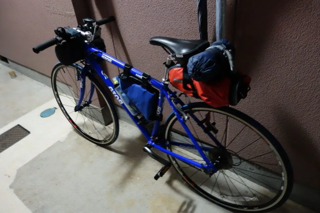 装備は下記の画像のように輪行袋や着替え、モバイルバッテリー、補給食、リペアツールなどを持っています