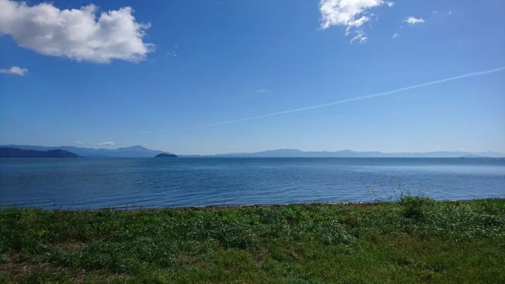 しばらく下りを楽しむと琵琶湖がみえてきます