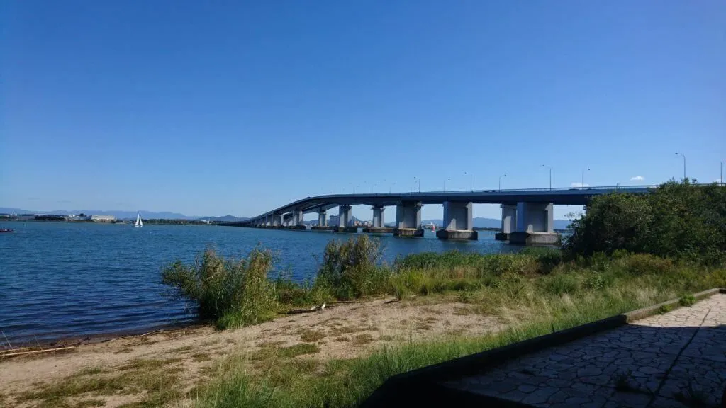 「琵琶湖やー!」ということで琵琶湖を楽しみ、途中のチェックポイントである琵琶湖大橋を目指します