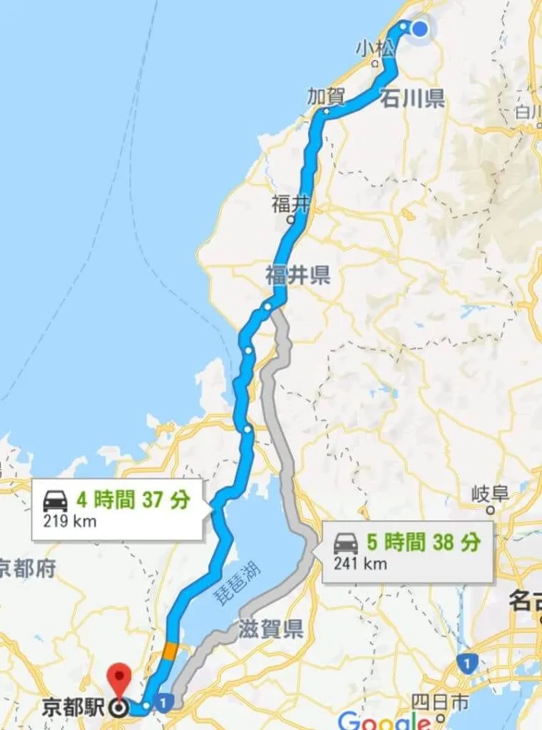 敦賀までは同じルートでそれ以降は琵琶湖の西側を通るか東側を走るかです