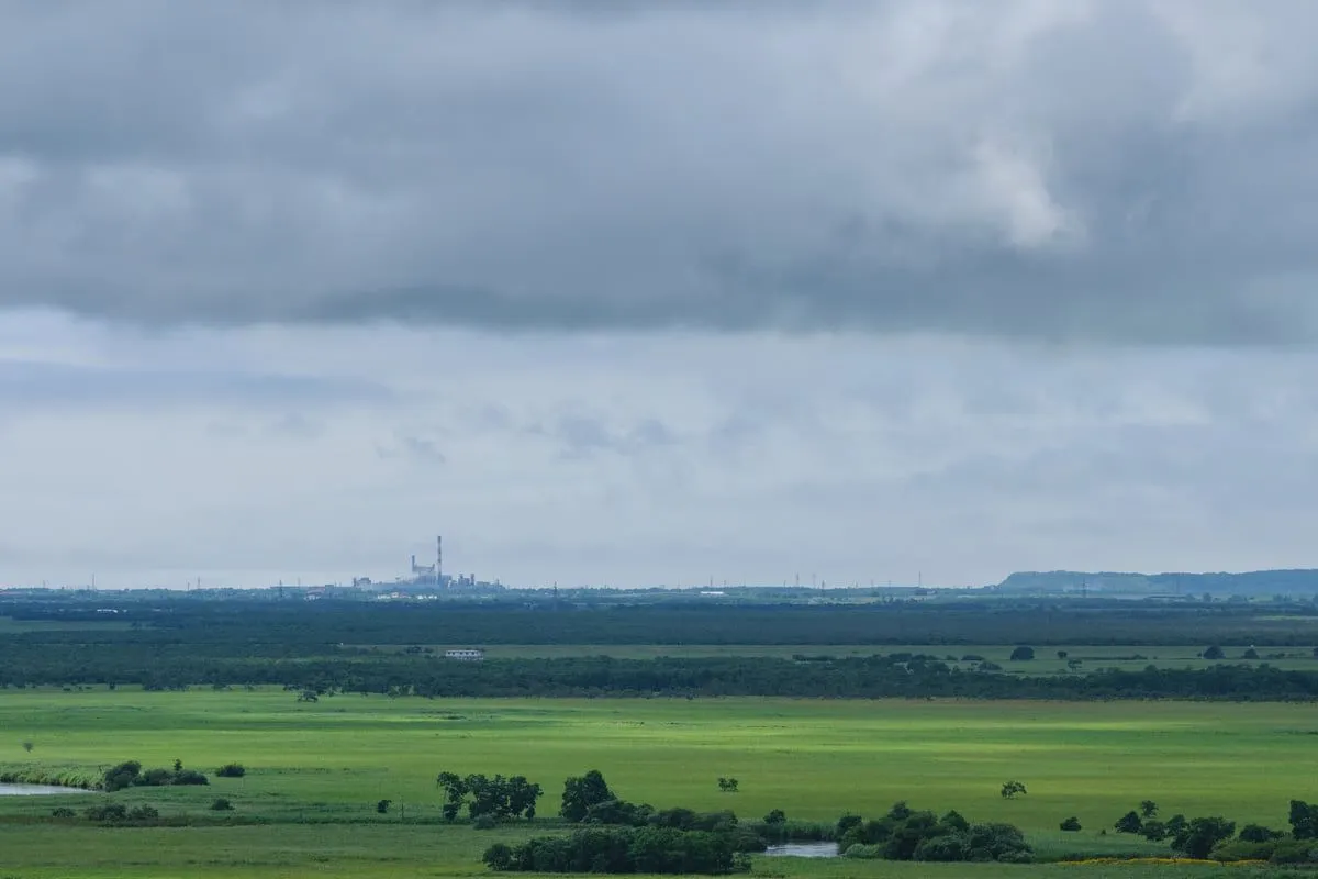 ちょっとおもしろいのが湿原の先に工場がみえる。